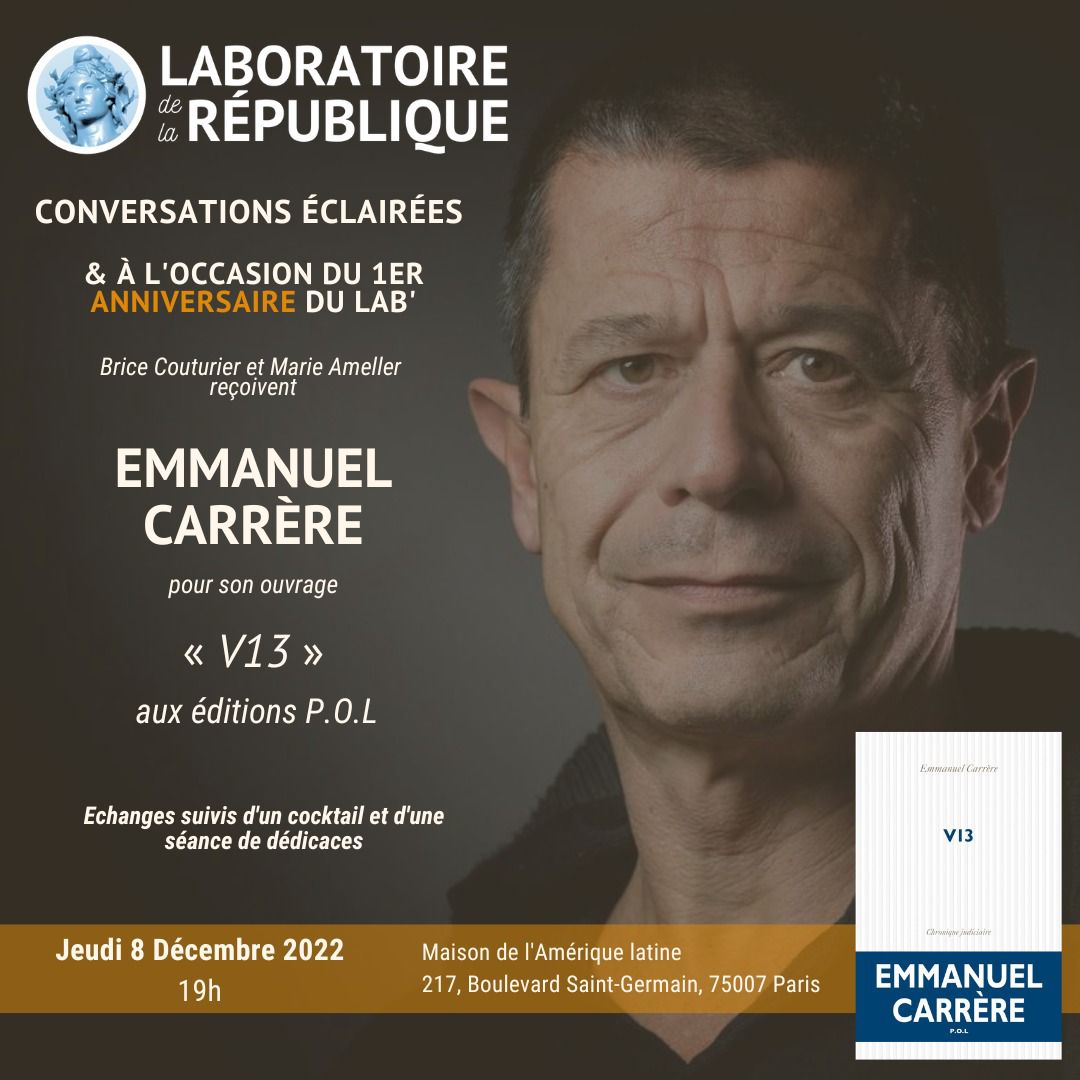 Jeudi 8 décembre prochain, le Laboratoire reçoit Emmanuel Carrère pour une nouvelle conversation éclairée autour de son ouvrage "V13" publié chez P.O.L. Nous fêterons, à cette occasion, le premier anniversaire du Laboratoire. Le procès